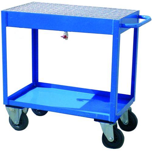 Carro con base de 800 mm x 600 mm y cubeta con grifo para la extracción de los productos derramados en la superficie. Fabricado en perfil de acero, superficies metálicas de gran resistencia. Carro utilizado para el lavado de piezas.
