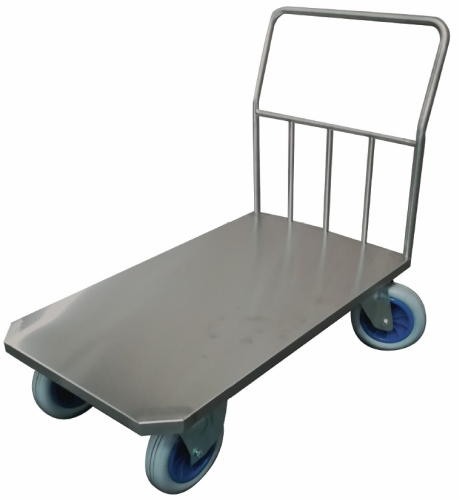 Plataforma de Inoxidable calidad AISI 304 con medidas 1.210x710, fabricada en tubo y perfil en inoxidable soldado con una capacidad máxima de carga de 800Kg. Superficie de chapa en inoxidable, dos ruedas fijas y dos giratorias impinchables, que permiten una movilidad total del carro. Fabricación a medida, consúltenos.