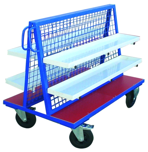 Carro porta herramientas, fabricado en Tubo y perfil de acero soldado y malla con luz de 40x40 mm. Posee 4 bandejas para el alojamiento de todo tipo de material. Superficie de fibra de madera roja, dos ruedas fijas y dos giratorias que permiten una movilidad total del carro. Fabricación a medida, consúltenos.