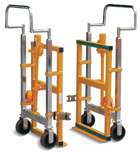 Elevadores para armarios y cajas fuertes muy útil para el transporte de armarios pesados cajas fuertes, mesas pesadas y o productos de gran pesaje, hasta 1.800 Kg. Provistos de dos ruedas de poliuretano para el mejor transporte por suelos lisos, palas de seguridad para la correcta elevación de las cargas. Cinchas de seguridad de 5 metros para el amarre de las cargas. De color amarillo.