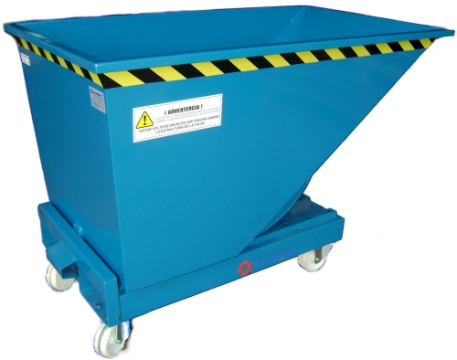 Contenedor con ruedas para el almacenamiento, transporte y sencillo volteo de productos diversos mediante pulsador de volteo situado en la parte frontal del castillete. El contenedor está preparado para colocar un sistema de protección contra deslizamientos, mediante cadena ( suministrado). Gran variedad de accesorios (tapas, cadena anti-deslizamiento), construcción estanca en acero pintado RAL 5010. Fabricado en chapa de 2 mm. Marcado CE. Fabricación a medida, consúltenos.