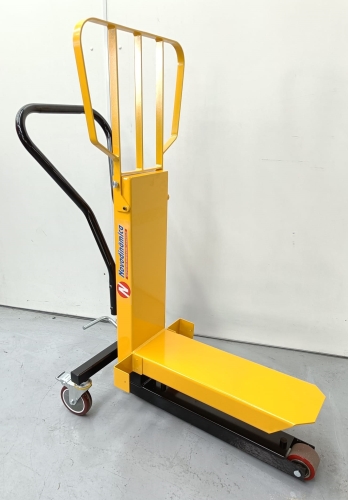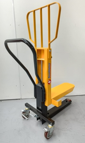 Transpaleta para la carga y descarga de 1/4 de pallet europeo. Ruedas de poliuretano en la horquilla y de goma en el timón. Preciso, con velocidad constante de bajada. Provisto de guias para asegurar la mercancía en el transporte.