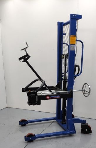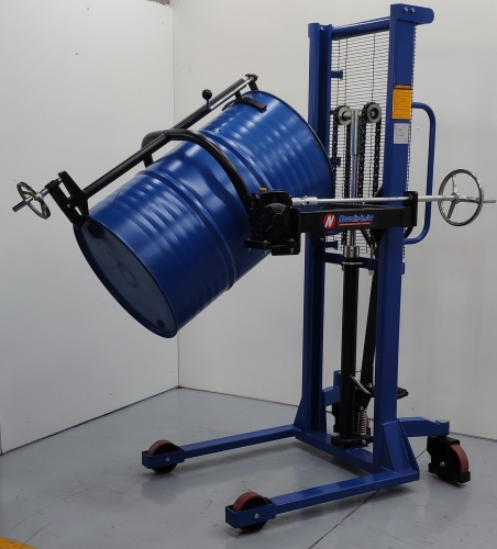 Apilador rotador de bidones, adecuado para bidones de acero y plástico de 220 L, gracias a su trinquete ajustable. Gracias a su manivela al reductor y a la bomba hidráulica, los bidones se elevan, giran, agitan, vacían y se transportan con gran facilidad. Para bidones de otras medidas y capacidaes accesorio ref. 20086