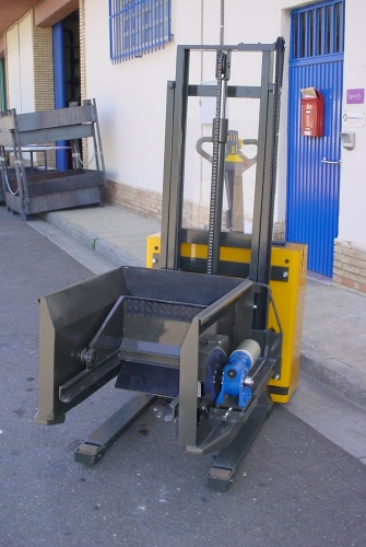 Apilador volteador de elevación y traslación eléctrica para manipulación de cajones hasta 400 Kg en espacios medianos / pequeños. Batería de 24 V. con una autonomía de 6 Horas en continuo. Timón de dirección con muelle de retorno. Cargador incorporado con indicador del estado de las baterías. Rejilla de seguridad. Claxon. Seta de emergencia. Marcado CE.