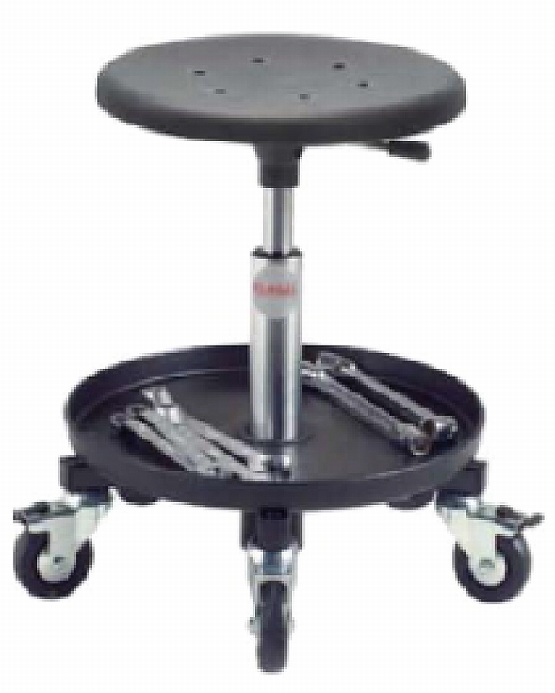 Assento em espuma de poliuretano moldada; prático, fácil de limpar, muito confortável e robusto, resistente a diversos produtos químicos. Inclui tabuleiro e rodas, duas das quais com travões.