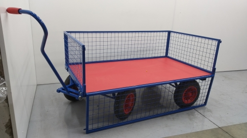 Reboque com puxador manual para cargas inferiores de 500 kg. Superfície em fibra de madeira para longa durabilidade. Doble Lateral em malha removível de 410 mm de altura. Pode ser fabricado a medida. Solicite orçamento.